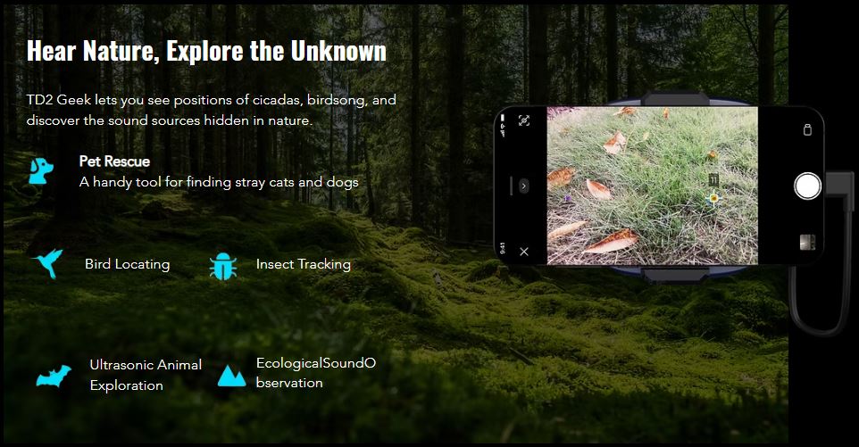TD2 Geek is like a hearing system with 64 “ears”, which “listens” to sounds from different angles simultaneously through array microphones and reconstructs the direction of the sound source in three dimensions to see where it comes from.
