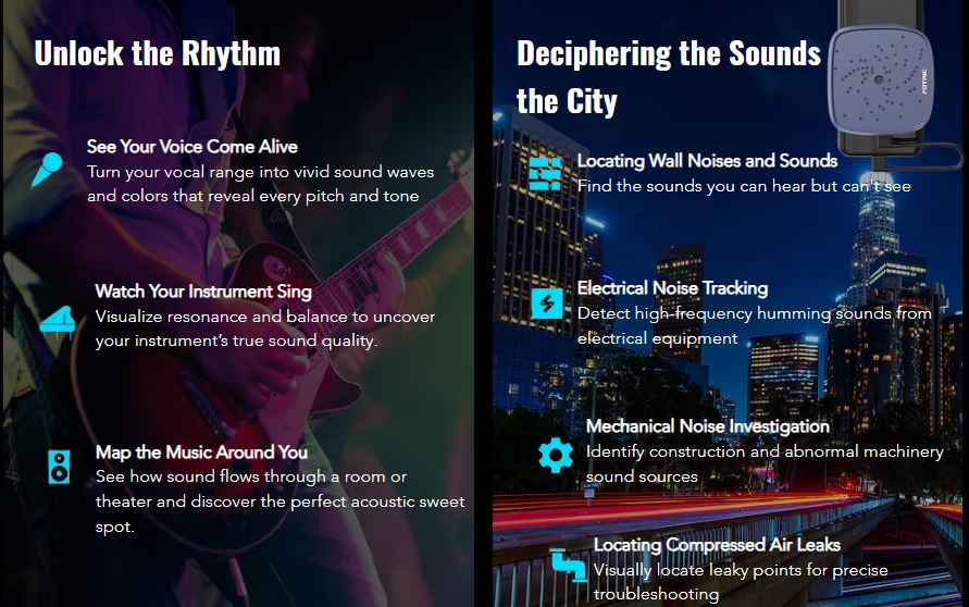 Imagine being able to see what you’ve only ever heard—that’s exactly what an acoustic imager does. It uses an array of tiny microphones to capture sounds all around you, then calculates where each sound is coming from and how loud it is.
