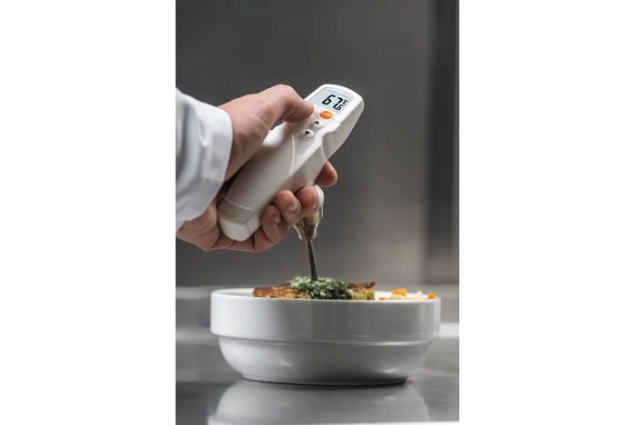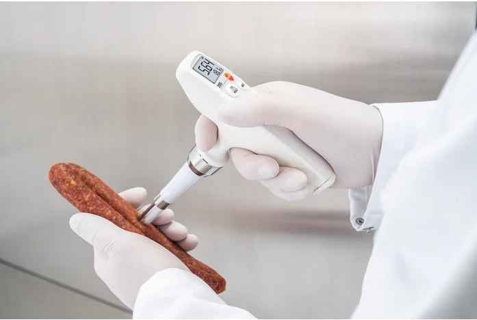 In food production, the pH value and temperature play a key role. With the testo 205, you can measure the pH value and temperature in semi-solid media at the same time. Since the pH/temperature measuring instrument is extremely robust, particularly the pH measuring tip, the testo 205 is frequently used to monitor the quality and degree of maturation of meat. For example, in butcher’s shops, slaughterhouses and in the meat-processing industry.